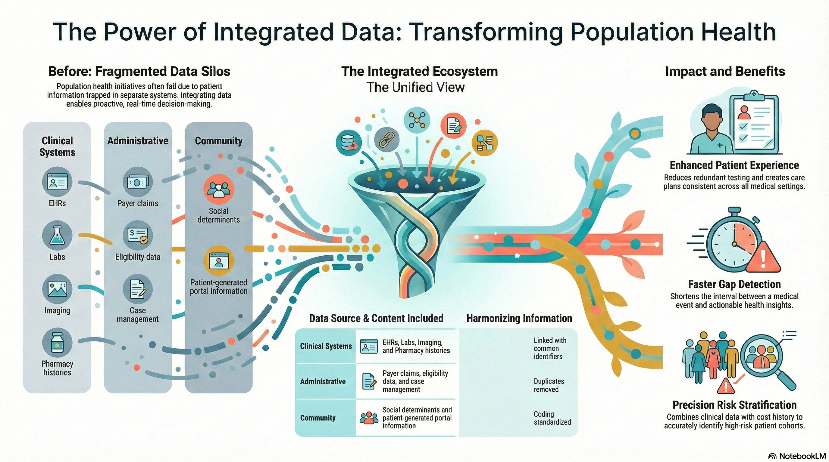Integrated data for population health management is a wide, ranging initiative covering all the aspects that influence risk and outcomes. Generally, it includes: